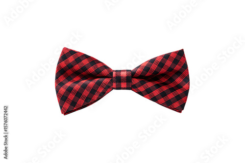 Red and black checkered bow tie with diagonal plaid pattern and classic formal style, isolated on a transparent background