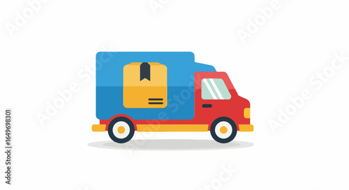 truck, delivery, van, cargo, box, shipping, logistic, transport, vehicle, freight, carrier, moving, haulage, courier, package, shipment, good, commerce, trade, supply, chain, distribution, service, transportation, commercial, automobile, motor, red, blue, yellow, graphic, illustration, icon, symbol, design, flat, style, cartoon, simple, clean, modern, isolated, white, background, wheel, tire, window, door, side