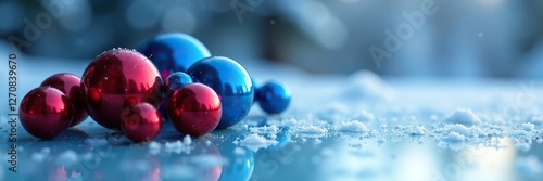 Red and blue metallic balls on a frosted glass table, winter, blue, metallic