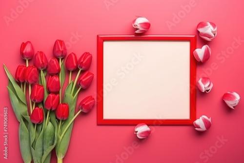 Red and pink tulips frame a blank space on a pink background. Vibrant Red Tulips Bordering Blank Frame