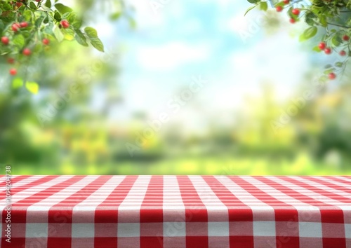 Red and White Checkered Tablecloth with Blurred Green and Blue Background for Picnic Setting