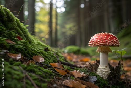mushroom, forest, autumn, nature, red, white, toadstool, fall, leaf, moss, wild, timberland, fungal, growth, natural, floor, plant, environment, vibrant, natural light, outdoors, detailed, texture, organic, non-urban, scenic, specific, unique, untouched, peaceful, serene, closeup, ground, botany, biology, ecosystem, flora, wilderness, tranquil, colourful, leafy, damp, earthy, underbrush, macro, beauty