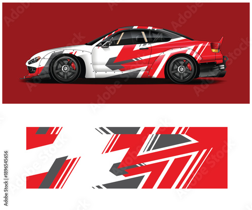 Red and white sports car with decals and design elements