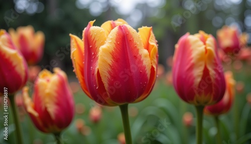 tulip, flower, garden, blooming, red, yellow, nature, flower petals, plant, spring, colourful, vibrant, flora, seasonal, closeup, growth, blossom, green, botanical, beautiful, landscape, arboretum, freshness, dew, romantic, arrangement, floral, decoration, aesthetic, lush, sunny, bright, happy, cheerful, fragrant, outdoors, natural, beauty, calmness, joyful, springtime, wildflower, environment, high-coloured, serenity