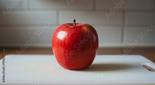Red Apple on White Cutting Board in Modern Kitchen with Soft Lighting