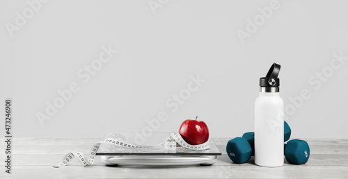Red apple, white tape measure around a water bottle dumbbells with glass bathroom scale on gray. Front view copy space. Healthy lifestyle, weight losing management and hydration concept banner