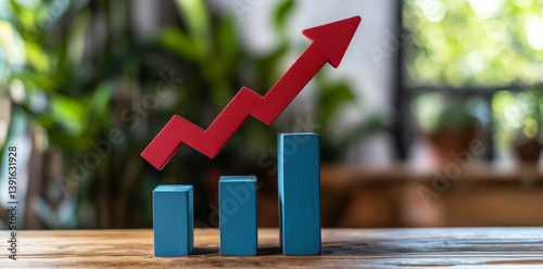 arrow, bar, graph, growth, upward, business, finance, statistic, success, increase, analysis, datum, performance, chart, marketing, strategy, investment, economy, progress, visualisation, wooden, colourful, design, trend, measurement, achievement, positive, direction, symbol, creative, modern, office, workspace, nature, indoor, plant, background, blurred