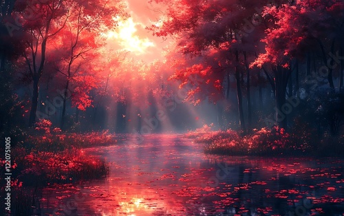sunset, sunrise, pink, cloud, sky, mountain, tree, water, lake, river, cherry blossom, flower, peaceful, serene, tranquil, magical, fantasy, artwork, digital artwork, illustration, painting, vibrant, colourful, scenic, landscape, nature, calm, beautiful, twilight, red, leaf, autumn, forest, stream, crimson, light, ray, sunbeam, red leaf, fall, timberland, still, blood-red, dreamlike, enchanted, mystery, path, flowing
