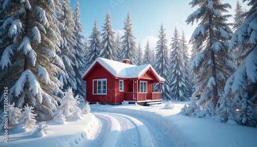 Red cabin sits in snowy Swedish forest. Tall fir trees covered in white snow surround the small house. A path leads to the remote woodland dwelling on a bright winter day.