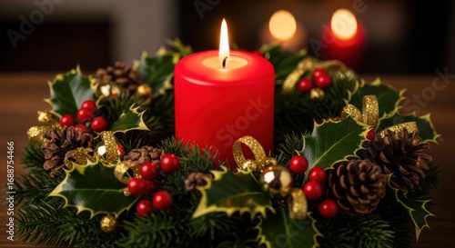 christmas, chaplet, candle, red, decoration, holiday, season, winter, festive, centrepiece, evergreen, holly, berry, pine cone, ornament, ribbon, gold, lighting, warmth, celebration, tradition, seasonal, event, home, interior