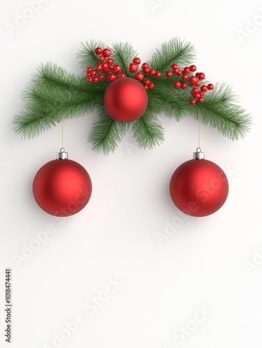 red Christmas baubles hanging from strings on a clean white background with delicate decorations.
