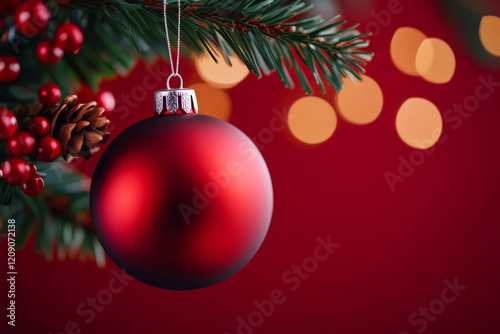 Red Christmas Ornament Hanging on Christmas Tree Branch with Blurred Background Lights