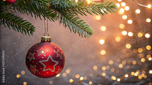 Red Christmas Ornaments and Stars on Xmas Tree with Glitter Bokeh Background and Twinkle Lights.