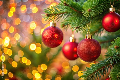 Red Christmas ornaments on tree with bokeh lights Aerial