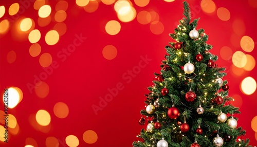 Red Christmas tree with gold and green ornaments, a festive holiday celebration