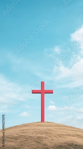 Red Cross on Hill Under Blue Sky Symbolizing Redemption and Faith, Christian Concept, Spiritual Landscape, Tranquil Scenery with Copy Space, Inspirational and Peaceful Atmosphere