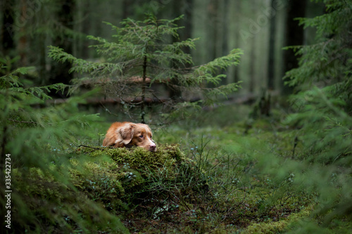 red dog in the spruce forest. Nova Scotia Duck Tolling Retriever in nature. Walk with a pet