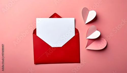 red envelope with a blank card sits beside two paper hearts on pink background.