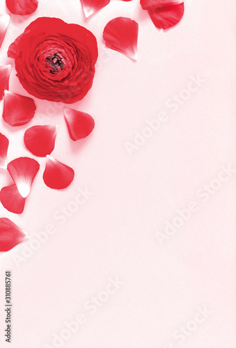 flower, romantic, red, light pink, pink, monochrome, ranunculus, rose, copy space, flower petals, concept, creative, day, decor, decoration, design, floral, holiday, march, mother, up high, spring, valentine, wedding, woman, engagement