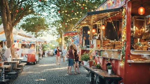 horizontal, photo, color image, food, market stall, selling, buying, meat, people, business, food and drink, outdoors, street, travel, choice, confidence, dusk, enjoyment, truck, market, cobbled, red, decorated, string, light, signs, side, inside, various, sandwich, chips, snack, potted, plant, counter, walking, white, tent, tree, colourful, lantern, sky, blue, festive, lively