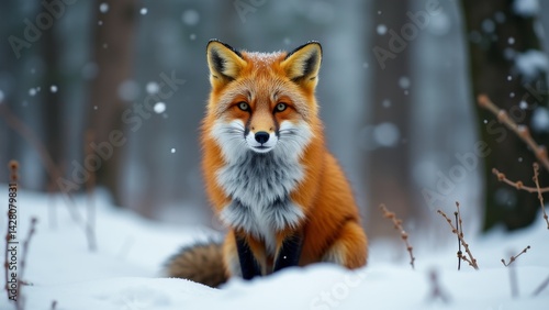 red fox, fox, winter, snow, forest, animal, wildlife, mammal, nature, outdoors, cold, winterly, seasonal, scenic, beautiful, wild, fauna, portrait, closeup, fur, furry, cute, alert, watchful, wilderness, environment, natural, wood, landscape, snowy, season, frost, freezing, copy space, background, tree, branch, winter landscape, wild animal, animal portrait, cold weather, snowing
