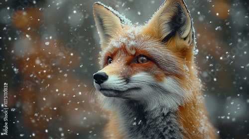 red fox with fluffy fur on snow ground