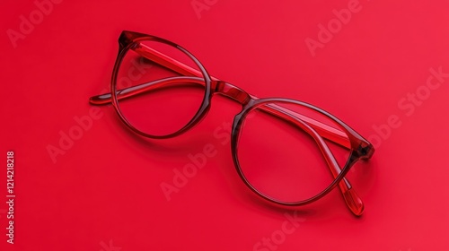 Red Frame Eyeglasses: A pair of stylish eyeglasses with a bold red frame rests elegantly on a vibrant red backdrop, evoking a sense of sophistication and sharp vision.