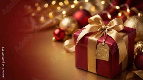 christmas, gift, present, holiday, festive, celebration, red, gold, ribbon, bokeh, ornament, bauble, decoration, wrapping, december, seasonal, winter, light, sparkle, new year, surprise, giving, love, joy, warmth, tradition, special occasion, package, box, blank, copy space, greeting, event, party, background, texture, glow, elegant, luxury, cheerful, happiness, concept, closeup, warm colors, festive season, merry