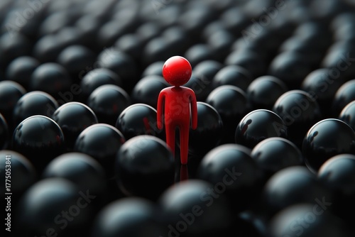 Red glossy human figure standing out among numerous glossy black spheres representing uniqueness and individuality