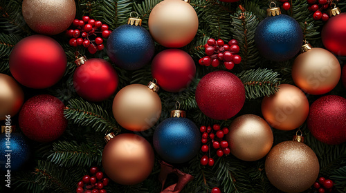 Red, Gold, Blue Ornaments Decorate Festive Evergreen Branches