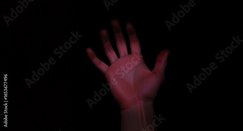Red Hand Reaching, Dramatic Dark Background Stock Photo