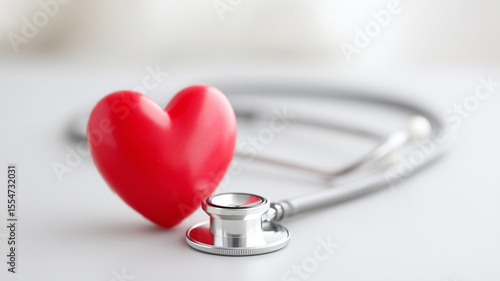 Red heart and silver stethoscope on white surface symbolizing healthcare and medical care