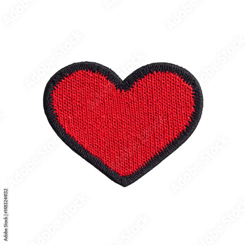 Red heart patch with black border, symbolizing love and affection, is isolated on transparency background. embroidered texture adds tactile element to design
