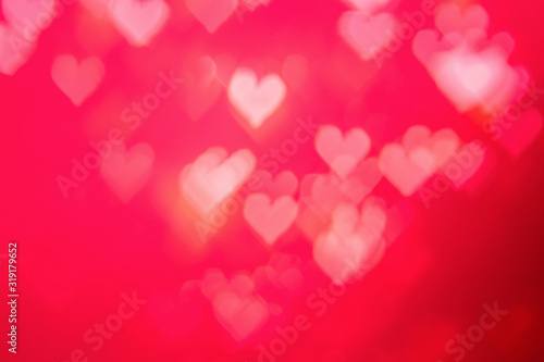 Red heat passionate and glamour bright bokeh background.Heart shaped bokeh red abstract background banner. Love theme illustration. Valentines day concept. Copy space. Decorative glitter design.