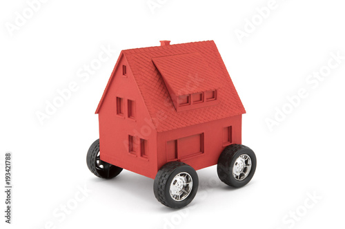 house, home, wheel, building, moving, move, concept, red, mobile, dwelling, relocation, removal, condo, estate, real, living, transport, transportation, vehicle, isolated, clipping, path, drive, go, residence, miniature, tire, car, trailer, truck, tiny, bungalow, logistic, send, delivery, supply, travel, journey