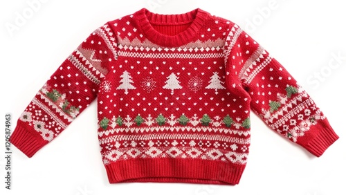 Red knitted Christmas ornated sweater isolated on white, winter holiday clothes. New year symbol. Knitwear.