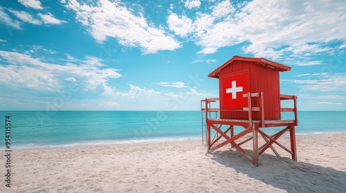 Red Lifeguard Tower on Sandy Beach with Blue Sky and Ocean