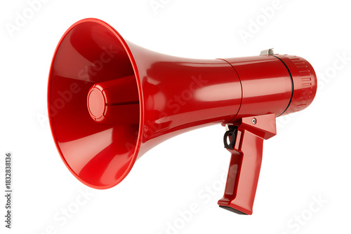 megaphone, bullhorn, red, communication, announcement, sound, voice, protest, rally, public address, loud, speaker, device, equipment, warning, alert, emergency, signal, amplification, shouting, promotion, marketing, information, message, isolated, object, studio shot, clean, simple, graphic, design element, nobody, single, bright, modern, technology, audio, white background
