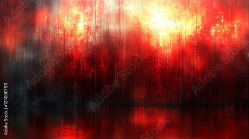 Red metal background with a brushed steel texture, reflecting light and showcasing a shiny iron plate. Modern and blurred empty space for captions, symbolizing chaos and industrial strength.