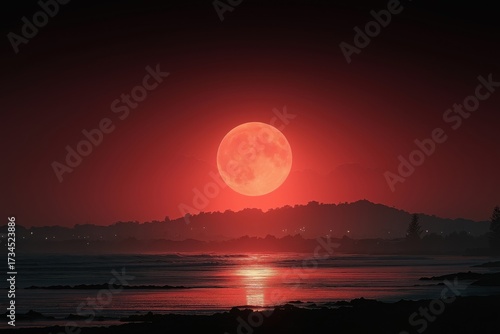 red, moon, blood, full, ocean, night, beach, landscape, sky, dark, sunset, sunrise, romantic, mysterious, dramatic, tranquil, peaceful, serene, astrophotography, astronomy, celestial, lunar, nature, panoramic, waterscape, silhouette, horizon, calm, wave, tide, coast, coastal, shore, glowing, bright, deep, orange, black, vibrant, scenic, beautiful, view, environment, natural, nobody, scene