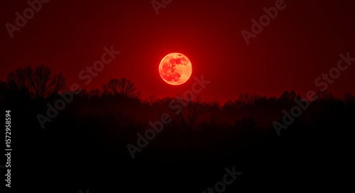 Red moon rising over dark forest landscape photography celestial event view
