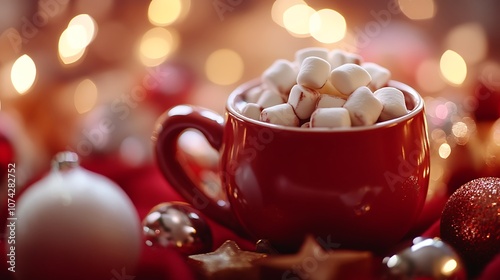 red, mug, cup, white, christmas, holiday, festive, cosy, warm, winter, drink, hot, chocolate, cocoa, sweet, treat, delicious, deliciously, sugar, light, bokeh, blur, background, ornament, ball, silver, gold, star, glistering, fabric, table, decor, season, joy