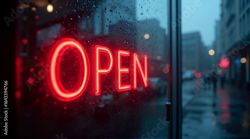 open, neon, signs, rain, window, city, street, dusk, business, red, glow, streaked, night, urban, shop, store, glasses, weather, exterior, building, traffic, dark, city street, neon sign, rainy day, red light, display window, urban scene, city life, night time, glass window, blur, light, road, sidewalk, evening