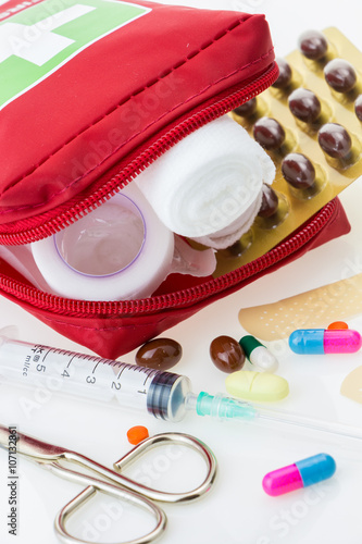 first, aid, kit, bag, health, help, medicals, medic, emergency, education, case, rescue, pharmacy, health care, cross, symbol, accident, safety, urgency, assistance, doctor, equipment, background, isolated, white, closeup, pill, drug, in plaster, band, gauze, scissors, wound, heal, syringe