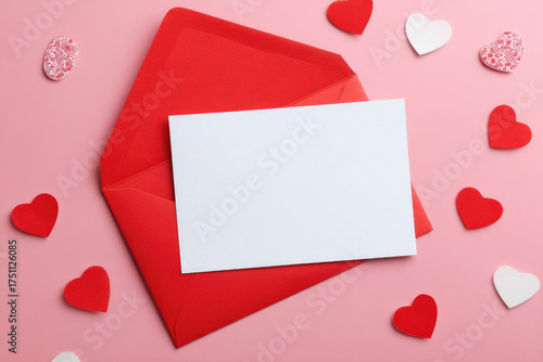 Red paper envelope with blank white note mockup inside and Valentines hearts on pink background. Flat lay, top view. Romantic love letter for Valentine's day concept
