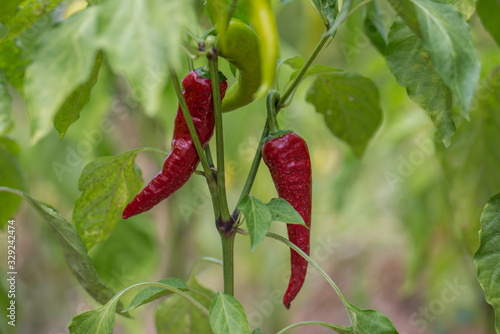 Red peppers grows on green branch, plantation of vegetables in greenhouse