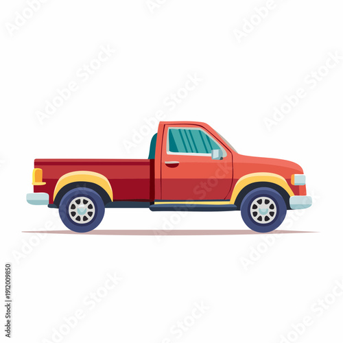 vehicle, truck, red, pickup, automobile, transport, cartoon, illustration, fender, flare, yellow, blue, tire, wheel, white, background, isolated, simple, design, graphic, rim, silver, chrome, door, handle, window, headlamp, rear lamp, bumper, classic, style, vintage, modern, minimalist, flat, colourful, icon, symbol, logotype, template, designer, element, object, clip art, image, art, creative, work, vector