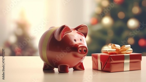 Red Piggy Bank with Open Gift Box and Christmas Tree