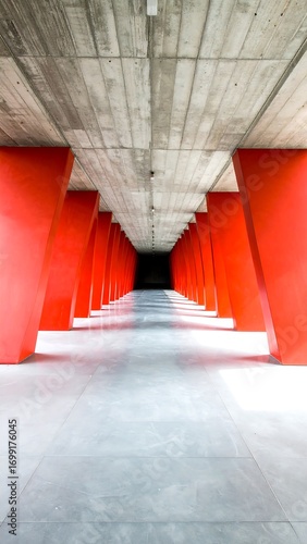 tunnel, red, concrete, pillar, architecture, perspective, interior, corridor, light, modern, grey, space, geometric, empty, passage, urban, design, structure, hallway, long, straight, vertical, horizontal, industrial, depth, monochromatic, exterior