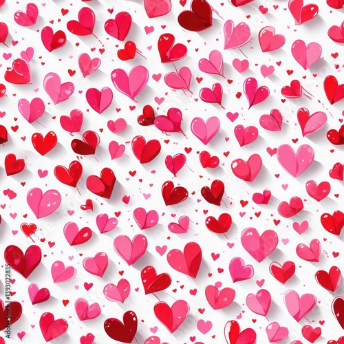 Red Pink Hearts Seamless Pattern. Hearts background on white. Many red and pink heart shapes form seamless repeating design.